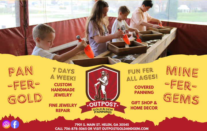 Strike it Rich in Helen, Georgia! The Outpost Gold & Gem is a family attraction that is fun for all ages. Try your luck with our Georgia Gold Rush Paydirt Buckets filled with either Concentrated Gold or take a chance on our Gemstone Buckets with rare earth gems, such as rubies, sapphires, emeralds, amethyst, topaz, and more! All of our panning tables are covered and we are open rain or shine. Get hands on lessons from our trained and helpful staff. They are always nearby to help you identify your finds and evaluate them. After you are finished, don't forget to stop by our gift shop, Southwestern Outpost!
